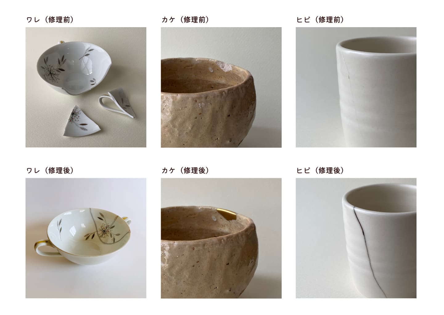 また、一度割れてしまったうつわは繊細なものです。万が一の郵送事故などでお客様の大切なうつわを破損しないためにも、お返しの際も配送ではなく、ご来店いただき直接お渡しさせてください。お見積もり、お受け取り共にご来店のお手間をおかけしますが、お客さまと直接お会いして、安心していただくことを大切にしています。
